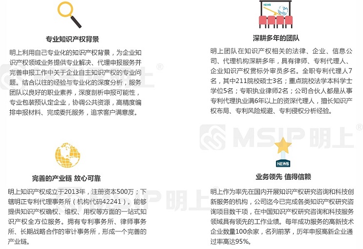 1、專業(yè)知識(shí)產(chǎn)權(quán)背景——明上利用自己專業(yè)化的知識(shí)產(chǎn)權(quán)背景,為企業(yè)知識(shí)產(chǎn)權(quán)領(lǐng)域業(yè)務(wù)提供專業(yè)解決、代理申報(bào)服務(wù)并完善雙軟認(rèn)證中關(guān)于企業(yè)自主知識(shí)產(chǎn)權(quán)的專業(yè)問(wèn)題。
