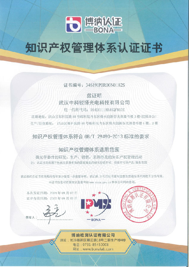 祝賀丨武漢中科銳擇光電科技有限公司獲得國家級知識產(chǎn)權貫標認證!