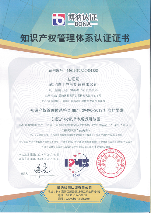熱烈祝賀武漢騰江電氣制造有限公司于2019年9月獲得知識(shí)產(chǎn)權(quán)貫標(biāo)認(rèn)證證書,這意味著騰江電氣在知識(shí)產(chǎn)權(quán)領(lǐng)域獲得到重要認(rèn)可,在知識(shí)產(chǎn)權(quán)方面得到進(jìn)一步規(guī)范和在綜合競爭力得到進(jìn)一步提升。